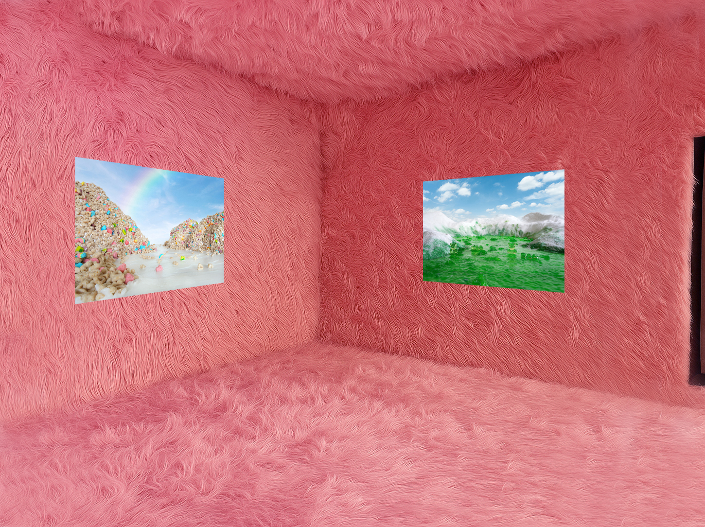 The immersive installation begins with softness: pink, plush carpet underfoot, sweet aromas in the air, clouds of pastel color, and forests made from gumdrops, whipped cream, melted candy, and cereal rubble. At first glance, the settings shimmer with confectionary innocence. Yet each tableau carries a fault line: a chocolate bunny sinking into its own sugary ground; lollipop hearts slumped and bleeding into pools of syrup; extravagant candy forests dissolving under an invisible heat. Even the cereal landscape — bright marshmallows embedded in mounds of processed grain — suggests ecological drift, industrial excess, and the sedimentation of consumer culture.